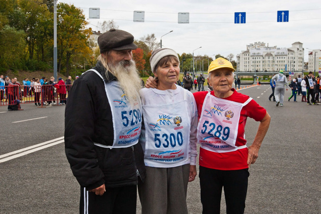 Немало было и ветеранов физкультурного движения. Вот финишную черту пересекла колоритная пожилая пара - Нина Михайловна и Вячеслав Петрович Дорофеевы. Возраста своего бегуны не скрывают: ему - 68, ей - 75. Пробежали они километр, не без подготовки, конечно. Уже лет 15 оба занимаются в клубе «Будь здоров!».