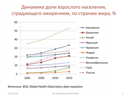 Марина Колосницына, профессор Национального исследовательского университета ВШЭ, во время своего визита во Владимир факторы растущего ожирения разделила на два подвида: технологический (автоматизация производств и домашнего труда, автомобилизация и распространенность полуфабрикатов) и экономический (доступность дешевой еды, развитие фастфуда, мощный маркетинг производителей продуктов питания). То есть мы почти не двигаемся, пешком не ходим, на работе физически не ломаемся, зато едим все больше. С Колосницыной согласен Дмитрий Пискунов, кандидат медицинских наук и руководитель управления по работе с партнерами и медэкспертизе группы «АльфаСтрахование»: