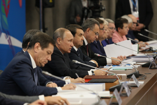 Овациями зал приветствовал появление Президента России Владимира Путина. Он обратился к участникам заседания с краткой речью.
