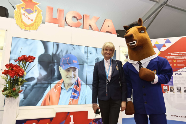 Яркие звезды и первые красавицы российского спорта - в Доброграде. Гимнастка Светлана Хоркина на форуме подчеркнула свою принадлежность к ЦСКА. Талисманом армейцев на выставке в Доброграде был вот такой забавный, но внушительный конь.