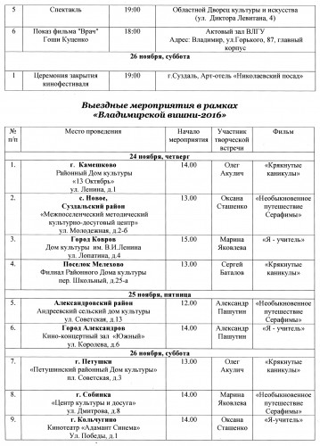 Завершит свою работу фестиваль в субботу, 26 ноября. Торжественная церемония закрытия пройдет в Суздале в «Николаевском Посаде». Вход свободный, равно как и на все творческие встречи, а также кинопоказы.