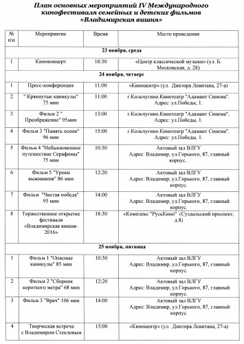 Всего в программе фестиваля девять фильмов. Их покажут во Владимире, Кольчугине, Коврове, Камешкове, Петушках, Собинке, Александрове и даже в некоторых сельских ДК.