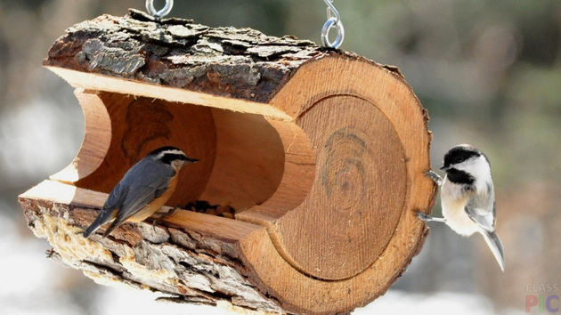 Как вариант, деревянную кормушку можно изготовить из старого бревна. Для этого необходимо вырезать и очистить его сердцевину, а также придумать прочную подвеску.