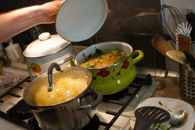 Далее следуют несколько ложек грузинского соуса ткемали, который готовят из сливы ткемали с добавлением кинзы. А потом слои блюда повторяются в том же порядке, пока кастрюля не будет заполнена доверху. Перед тем как ставить ее на огонь, туда еще вливают стакан белого вина. А дальше остается только ждать часа два с половиной, вдыхая божественный аромат.