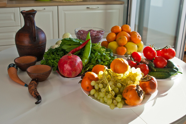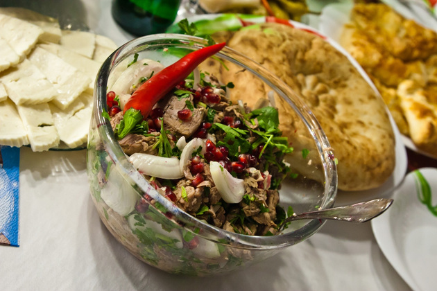 Если вы думаете, что все время приготовления чакапули мы истекали голодной слюной, то вы ошибаетесь. Второй принцип грузинской кухни - «много блюд». Для всего, что наготавливают хозяйки, как правило, даже не хватает места на столе, поэтому тарелки со снедью, которые подносят во время трапезы, ставят этажами.