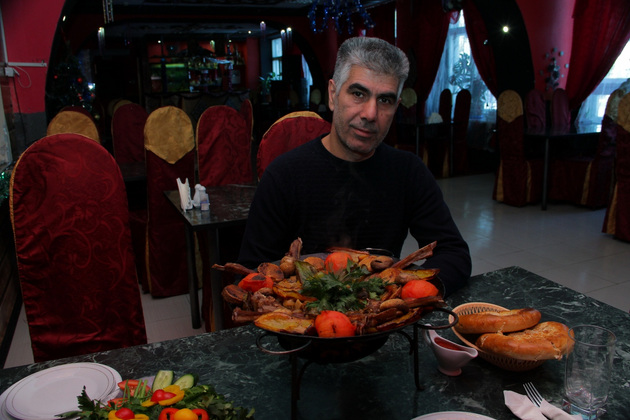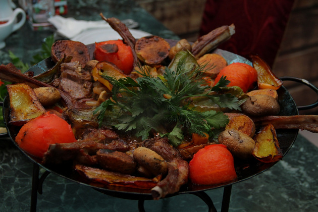 Блюдо, которое для нас приготовили, называется так же, как и сковорода - садж. Угощают им самых почетных гостей и виновников торжества: именинника, жениха с невестой на свадьбе. Этим блюдом сын потчует приехавшего погостить отца. За саджем встречаются братья и друзья. Как нам объяснили, это блюдо для длинного задушевного или конфиденциального разговора небольшой компанией. Подается оно на подставке с горячими углями, благодаря чему долго не остывает, поэтому беседа за ним может длиться часами.