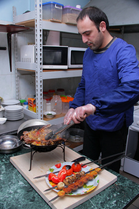 Шеф-повар «Старого Баку» Намик Мириев ‑ настоящий виртуоз. Он успевает следить за двумя сковородками на плите (на одной жарится баранина, на другой ‑ овощи), а параллельно раздувает огонь в мангале. На углях будет жарить овощи для саджа. У него уже подготовлены три шампура: с помидорами, шампиньонами и картофелем в мундире. Пока овощи приобретают румяные бока, полуготовая баранина перемещается в садж к овощам. А на оставшемся от нее масле с соком обжариваются дольки болгарского перца. Намик летает от плиты к мангалу, успевая поворачивать шампуры, мешать содержимое саджа, а параллельно готовит букет из петрушки ‑ для украшения почти готового блюда.