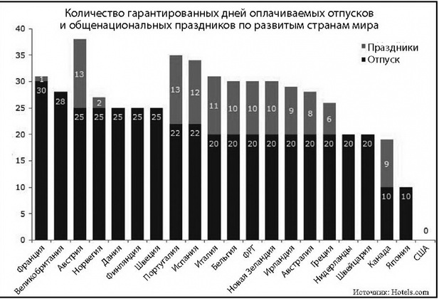 Для сравнения, во Франции отпуска длятся по 30 дней, но там лишь один государственный праздник, дающий гарантированный выходной, - День взятия Бастилии. В Австрии, Норвегии, Дании, Финляндии, Швеции 25-дневные отпуска, при этом у трех последних стран не предусмотрено никаких госпраздников с обязательными выходными. В Италии 20 отпускных дней и 11 общенациональных праздников, в Германии - 20 и 10 соответственно. В Канаде работодатель обязан оплатить работнику лишь 10 дней отпуска и отпустить его на оплаченные выходные на 9 госпраздников. В Японии человек может гарантированно рассчитывать лишь на 10-дневный отпуск в году. А вот в США вообще полный капитализм ‑ там нет ни гарантированных отпусков, ни дополнительных выходных по случаю праздников, хотя, понятно, что ценные кадры с работодателями все равно договариваются...