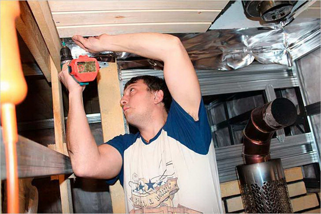 Потолок также нужно утеплить и покрыть слоем фольгированного материала. Для обшивки можно использовать доски хвойных пород.