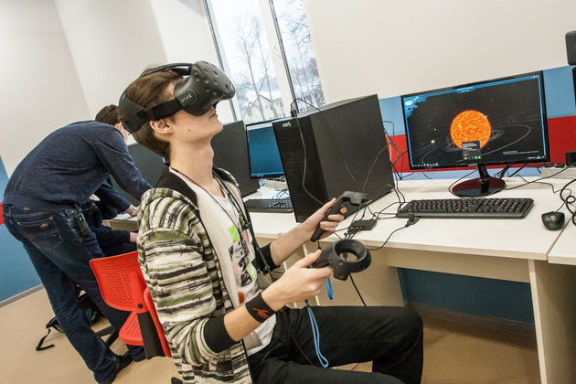 Дверь напротив ‑ лаборатория виртуальной и дополненной реальности. Тут изучают и создают воображаемые миры. Все, наверное, слышали о виртуальных тренажерах для летчиков? Так вот, здесь школьники учатся создавать подобные симуляторы. Их используют при обучении врачей, военных, космонавтов, железнодорожников. Дизайнеры с помощью таких программ «примеряют» свои макеты. Надел очки - и оказался в собственноручно нарисованной комнате. Можешь проверить, удобно ли расставлена мебель, например.