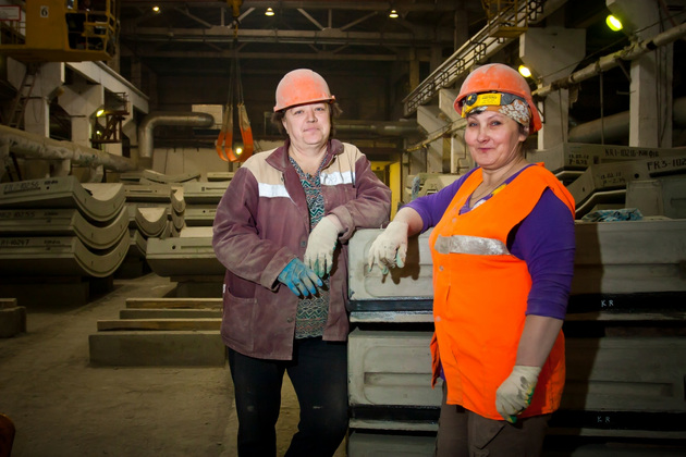 В цехе по производству плит мы встретили мастера Елену Груздеву и контролера ЖБИ Марину Старшову. Несмотря на знакомые операции по контролю качества, на их лицах - сосредоточенность, ответственность за порученное дело. Брак такие строгие сотрудницы точно не пропустят!