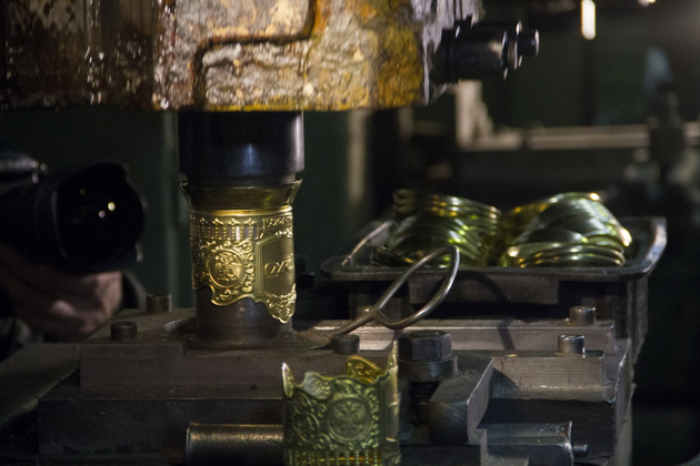 А начинается производство кольчугинской посуды с больших рулонов высококачественной металлической ленты, поставляемой по кооперации другими предприятиями УГМК. Рулоны устанавливаются на специализированное оборудование, после чего лента разматывается и подается на штамповочный пресс для изготовления заготовок. На заготовку штамповщик наносит оттиск с матрицы ‑ на пластине появляется чеканный рисунок. На следующем этапе эту пластину сворачивают и спаивают. После чего следует технологическая операция «склонение» - подгиб нижнего края. Остается только соединить узорную часть подстаканника с донцем, запрессовать конструкт и припаять ручку. Донца и ручки изготавливаются отдельно.