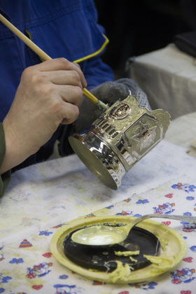 На уже никелированные или посеребренные подстаканники вручную кисточкой наносится защитная эмаль. Нужно оставить незакрашенными только те части, что потом станут золотыми, например тонюсенький ободок, обрамляющий центральную вставку.
