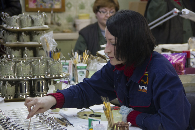 Между прочим, изделия с портретами вождя народов или гербом СССР заказывают у кольчугинских мастеров и сегодня. В основном киношники для съемок сцен в кабинетах военачальников или министров. Но все же в спросе более актуальная тематика. Например, к чемпионату мира по футболу в 2018 году будут выпущены новые подстаканники - их дизайн сейчас разрабатывается.