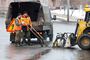 Затем яму нужно очистить от асфальтовой крошки, грязи и воды. Но по улице весенним днем непрерывно текут ручьи. Машина прикрытия с предупреждающими знаками встает перед ямой, на проезжую часть выходят люди в оранжевых жилетах.