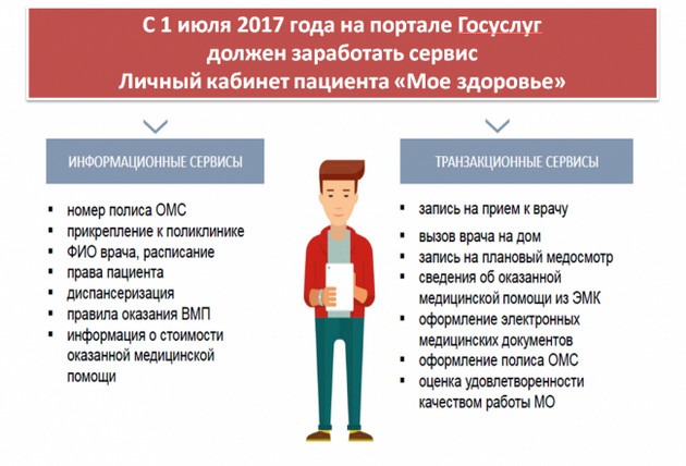 Кстати, с июля 2017 года на Едином портале госуслуг начнет работу личный кабинет пациента «Мое здоровье». Новый сервис будет полезен тем, кто хочет оформить полис ОМС, уточнить прикрепление к той или иной поликлинике или участку, получить информацию о стоимости оказанной медпомощи. В личном кабинете будут храниться данные о ранее пройденных обследованиях и обо всех обращениях к врачам.