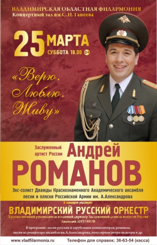 Во Владимирской областной филармонии с программой «Верю. Люблю. Живу» выступил новый солист Андрей Романов. Его драматический тенор умеет добраться до самой глубины человеческой души слушателя и вывернуть ее наизнанку.