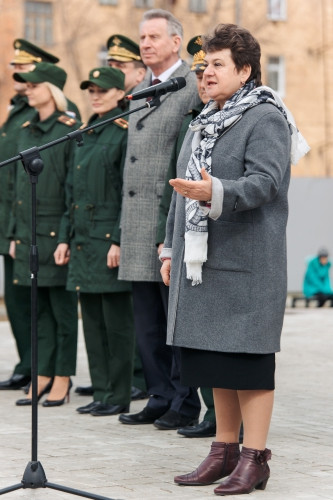 Торжественный митинг прошел на площади воинской славы. Светлана Орлова рассказала участникам митинга о том, что она была построена методом народной стройки, о том, что вся история присвоения городу статуса города воинской славы - это был единый патриотический порыв горожан.