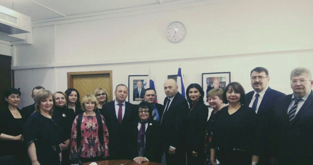 На снимке: Посол Израиля Гарри Корен, руководитель АРС-Пресс Софья Дубинская (в центре) и региональные редакторы на встрече в посольстве.