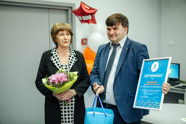 50-тысячный абонент IP-TV - Людмила Курмаева. Кроме роскошного букета Людмила Мустафаевна получила в подарок год бесплатного обслуживания в «Ростелекоме». Самой верной абоненткой компании стала жительница Владимира Татьяна Шумова, у которой с 2012 года подключены три услуги «Ростелекома».