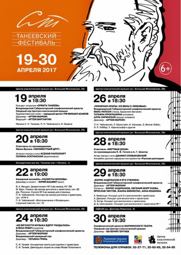 Танеевский фестиваль, посвященный памяти уроженца Владимира, выдающегося композитора, ученого-музыковеда, преподавателя Сергея Ивановича Танеева, продлится до 30 апреля. В программе фестиваля - выступления выдающихся артистов и музыкальных коллективов, являющихся символами российской культуры. В субботу 22 апреля в концертном зале им. Танеева состоится концерт камерного ансамбля "Солисты Москвы" под управлением Юрия Башмета. 29 апреля в Центре классической музыки будет играть виолончелист Борис Андрианов с учениками. Закрывать фестиваль приедет Валерий Гергиев с Симфоническим оркестром Мариинского театра.