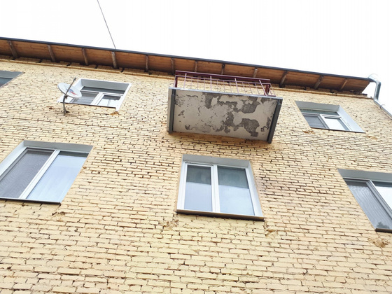 Дворовая стена дома так и не отштукатурена. Одну квартиру на 1-м этаже отштукатурили, остальную поверхность стены просто выкрасили в другой цвет. По всей поверхности стены раствор в кирпичной кладке крошится. Новые балконные плиты осыпаются. Жильцам страшно выходить на свои «обновленные» балконы, хотя до ремонта они были безопасными.