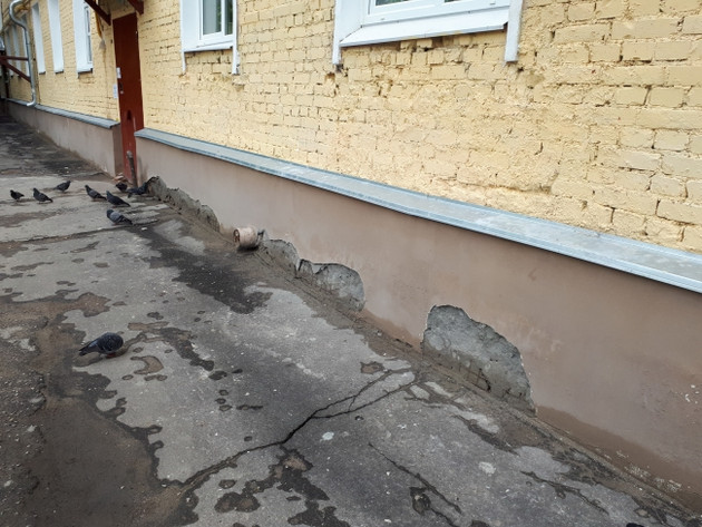 Первые же осенние дожди показали: краска, нанесенная на фасад, - не водостойкая. Дом «украсился» водяными разводами, а весной на фасаде начала осыпаться штукатурка. Она не выдержала и трех месяцев с момента ремонта.