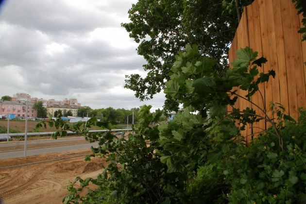 Чуть ниже домов - довольно высокий новый забор, призванный, очевидно, отгородить от прекрасной новой магистрали неказистые места старого Владимира. Забор в одном месте тросиками притянут к деревьям и привязан к ним. Когда мы это снимали, появился молодой человек в джинсах и с барсеткой. Представиться он отказался, но жители говорят, что это мастер рабочих. Мужчина громко прокомментировал привязанный к деревьям забор: это, мол, лишь на время его приваривания к металлическим столбам. Тогда непонятно, почему не отвязали, если уже все приварили? К тому же есть казус: за домом № 11 этот забор не привязан, и при порывах ветра он заметно «пляшет».