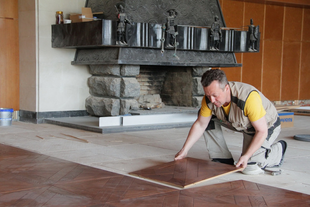 Сейчас Олег Акимов восстанавливает паркет в ГТК «Суздаль». Работа, говорит, несложная, но объемная и срочная - надо успеть к 40-летнему юбилею Турцентра в конце июля.