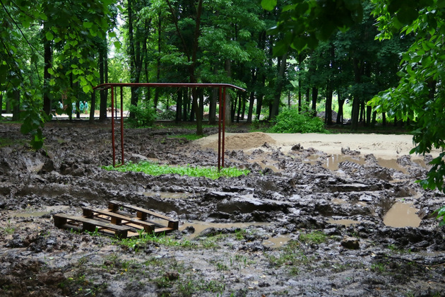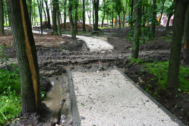 У рабочих своя правда. Сроки поставлены сжатые – сдать работу надо к 15 августа. А погода дождливая. Вот и загнали крупногабаритную технику туда, где надо было бы работать ювелирно – мини-трактором, если не вручную. В результате – полностью перепаханный сквер, напоминающий сейчас танкодром после учений.