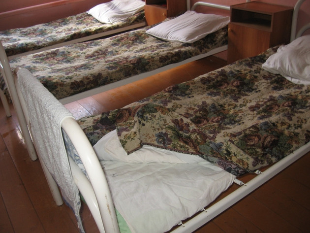 Унылая и неприглядная картина в спальнях. Комнаты на 8-12 человек. В них сыро. На стенах и потолке закрашенный краской грибок. Детям вредно здесь дышать. Матрасов на кроватях с железной сеткой практически нет. Они, по-видимому, прогнили за несколько зим. Подушки превратились в бесформенные лепешки. Постельное белье влажное и несвежее.