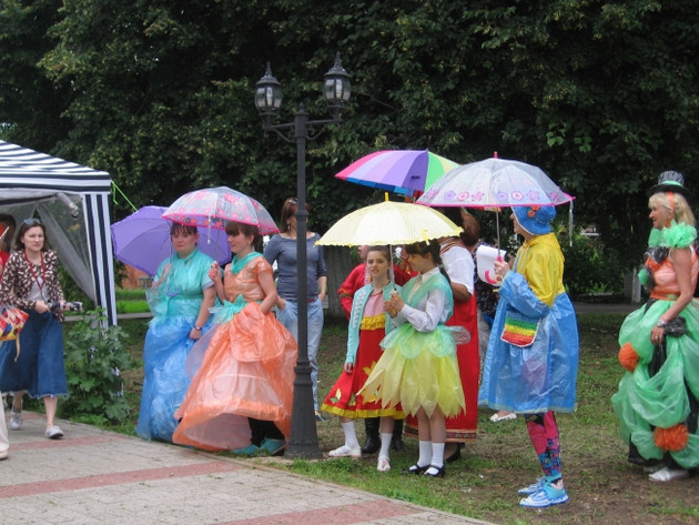Участников фестиваля не испугал внезапно поливший дождь. Организаторы предусмотрели и этот вариант. Через мгновение стало разноцветнее и веселее от зонтиков, плащей и навесов. Пригодились и крытые тентом площадки.
