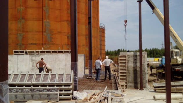 При въезде на территорию завода строятся гигантские весы, где будут взвешивать битумовозы. С весов машины будут следовать мимо складских площадок и корпусов на эстакаду, расположенную у забора со стороны деревни Рукав. Здесь битум будет сливаться и по системе трубопроводов поступать в производство.