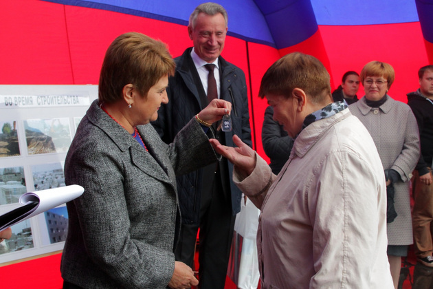 Дом № 9а на улице Белинского виден издалека. Построенный из белого кирпича, он выглядит современно и парадно. И новоселов замечаешь сразу. Зарядивший еще с ночи сентябрьский дождь не смог испортить им настроение. Многие из них годами ждали этого дня, жили на съемных квартирах, и от того неудивительно их приподнятое настроение - они пришли за ключами к новой жизни.