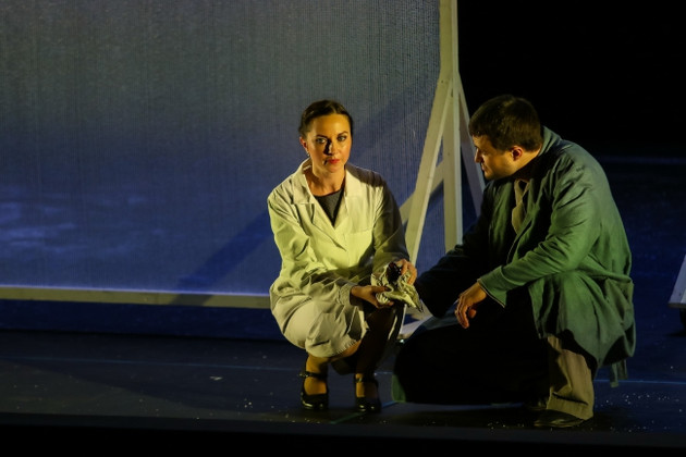 Спросите, при чем тут рак? Параллели в спектакле выстроены совершенно четкие: ГУЛАГ и создавший его строй ничуть не лучше рака, с которым пытается то ли бороться, то ли уживаться несчастная палата обреченных. Сталинская система будто наперегонки с болезнью истребляла людей, не щадя ни стукача, ни героя, ни восторженную комсомолку, ни прекрасного врача. Вот, кстати, персонаж врача: Людмила Донцова в исполнении замечательной Анны Зайцевой. Строгий образ человека трудных решений, будто осажденного со всех сторон, вымотанного чужими бедами и уже не способного эмоционально среагировать на собственное горе, Ане очень удался. На контрасте мы видим образ юной Аси (Ариадна Брунер), фееричной дурочки, еще не битой печалями, распираемой жаждой жизни и потому предельно категоричной: «Без ноги — не жизнь!» И как же страшно потом она ломается, удержавшись от полного падения лишь благодаря подставленному плечу Демки (Иван Антонов), того самого, без ноги, прицепившись к нему, как маленький израненный котенок...