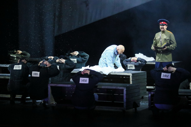 За сценографию и свет спектакля их создателям Дмитрию Дробышеву и Сергею Скорнецкому — отдельное спасибо. Они сумели на одной сцене атмосферно развернуть затрапезную палату в дрянной больнице, передать страх, мрак и холод жуткого лагеря на севере Казахстана и даже символически взгромоздить над всей страной непередаваемо давящую мощь культа Сталина, обратившего, как это наглядно показано в спектакле, богатства нашей щедрой земли в горы окровавленных черепов под страшными монументами и инсталляции могильных крестов... А Кузнецов, пользуясь приемом флешбека, характерно представил каждого из ключевых персонажей. Например, министра госбезопасности Абакумова, который буквально из штанов выпрыгивает, стараясь загрузить лагеря и тюрьмы и надеясь, что такое первобытное рвение поможет выжить ему самому. Роль Абакумова досталась Анатолию Шалухину — и вы бы видели, как блестяще актер, стоя в струнку, трясся под взглядом Сталина (народный артист России Николай Горохов, не представляю, сколько времени он провел в гримерке ради этого образа). А тот по-иезуитски с ухмылочкой глумился: «Что, больше нет недовольных?», прекрасно зная, что недовольные есть при любом строе. Он хорошо знал людскую натуру, раз понимал: «Как уйду — еще лет 8 будут бояться, а потом начнут топтать». Поверженное гнусное величие всегда топчут — жаль, что поздно.