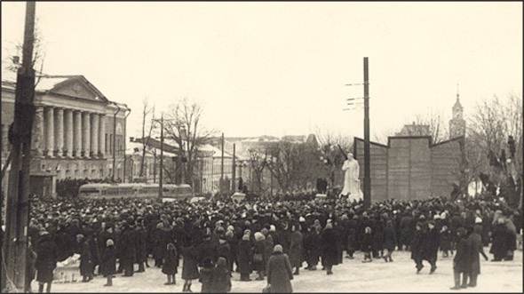 Напомним, что политика десталинизации, сопровождавшаяся сносом памятников и переименованием улиц и городов, началась с доклада Хрущева «О культе личности и его последствиях» на XXcъезде КПСС в 1956 году. Кампания набирала обороты постепенно и достигла кульминации в 1961-м, когда на XXII съезде было принято решение о выносе тела Сталина из мавзолея. Во Владимире в этот год снесли последние памятники вождю и переименовали проспект Сталина в Октябрьский.