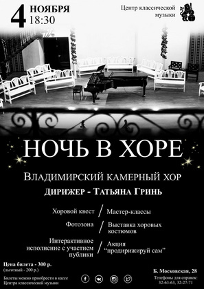 «Ночь искусств» - всероссийская акция, которая пройдет на площадках музеев, театров, выставочных залов, библиотек, а также на открытых пространствах. Владимирский камерный хор приглашает слушателей на экскурсию по закулисью, мастер-классы по сольному и хоровому пению, а также дирижированию. Любителям головоломок предложат музыкальны квест. Завершит «Ночь в хоре» концерт Владимирского камерного хора под руководством Татьяны Гринь. Цена билетов 200-300 рублей.
