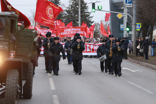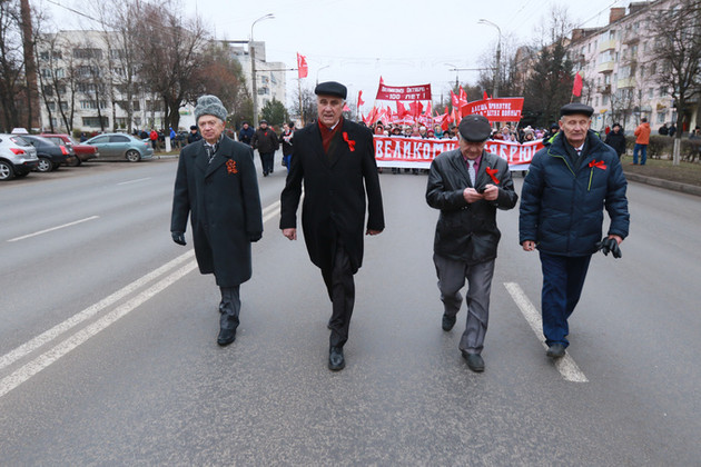 За «старыми большевикамив» текла основная масса демонстрантов под огромным транспарантом «Слава Великому Октябрю»: члены и сторонники КПРФ, современные комсомольцы, члены общественных организаций «Дети войны», «Союз советских офицеров» и других объединений левого спектра.