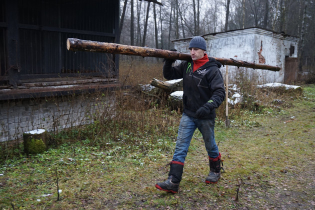 ...Тем временем рядом с Машиной клеткой припарковалась еще одна машина с московскими номерами. Из нее вышел парень в камуфляже и начал разгружаться: лопаты, грабли, щетки, щиты ДСП, болгарка, сварочный аппарат - все, что нужно сегодня в Леоново, у него с собой. Это доброволец Александр Свешников.