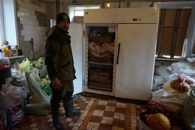 Заходим. Здесь - запасы, привезенные большей частью за прошедшие выходные: яблоки, капуста, мешки с собачьим кормом, крупы, макароны. В холодильнике - мясные обрезки. Евгений говорит, что мяса и овощей должно хватить лохматым постояльцам на неделю.