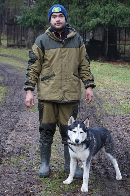 Неожиданно возле нас появляется голубоглазая хаски, а следом - и волонтер Евгений Литвинов из Санкт-Петербурга, приехавший спасать брошенных кинозверей.