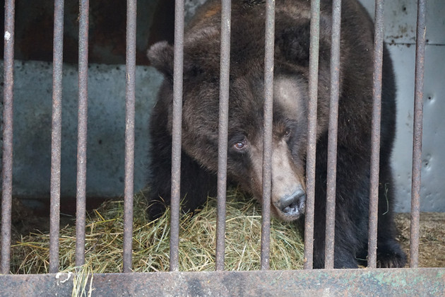 Возле клетки медведицы Маши, о которой говорят как об артистке с хорошей фильмографией, постоянное движение. Местный житель Артем Востоков разворачивает сварочный аппарат: надо закрепить кормушку. Хозяйка клетки равнодушно смотрит на переполох и всполыхи сварки.