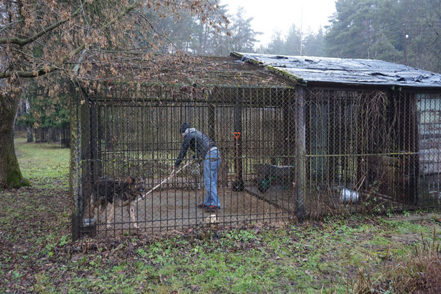 Сегодня попасть на зообазу можно без труда. Ворота при входе на ее территорию распахнуты. Подходим к дому сторожа под аккомпанемент собачьего лая. Так встречает людей только один пес из пяти, оставшихся здесь. Остальные четверо молча провожают нас взглядом, каждый из своего вольера. Людям они больше не верят.