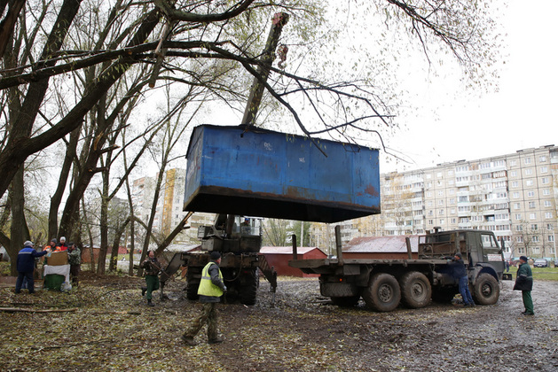 - Отойдите подальше, сейчас самое трудное будет – сдернуть коробку с места, - посоветовал нам завотделом ЖКХ администрации Фрунзенского района Сергей Мурыгин, лично наблюдавший за демонтажом.