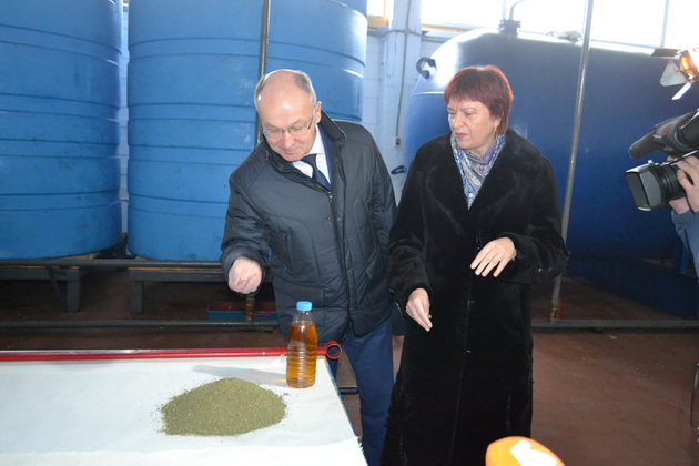 Сначала бригада ЗС поехала в многоотраслевое сельхозпредприятие «Борисоглебское». Там генеральный директор хозяйства Валентина Киренкова показала Киселеву работу цеха по производству рапсового масла. Это одно из новых в хозяйстве направлений. Рапсовое масло пока выпускается здесь только техническое, оно идет по большей части на биотопливо. И в «Борисоглебском» сеют рапс, в т.ч. озимый. Жмых, образующийся после отжима масла, добавляют на корм скоту.