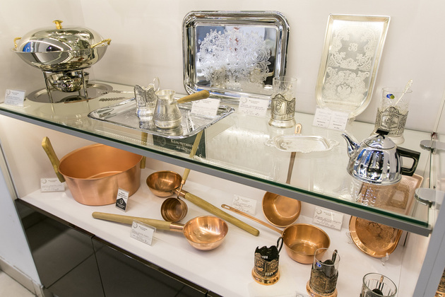 Домашних радостей в магазине «Кольчугинского мельхиора» много: от сотейников и кастрюль, тазов для варенья и мармитов до колец для сервировки и емкостей для икры, лопаточек для фруктов и вилочек для лимона. Для кофеманов - «правильная» медная турка, для любителей чая - подстаканники, самовары и чайники в традиционном кольчугинском дизайне. Фанатам легкого пара - большая линейка банных принадлежностей: шайки, ковши разных размеров.
