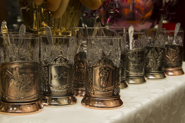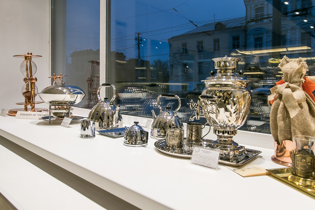 Витрины салона, как музейная экспозиция. По ней можно изучать историю страны, искусства и производства. Вот олимпийский Мишка улыбается с «экрана» подстаканника, рядом - серия, посвященная зимней Олимпиаде в Сочи, и новинка - медведи-футболисты тренируются накануне мундиаля. Для патриотов - продукция с изображением гербов, исторических деятелей и российских достопримечательностей, для поклонников искусства - «Охотники на привале» и богатыри, балерина, застывшая в па... Тут же актуальные Дед Мороз со Снегурочкой и востребованные в праздничные застолья подставки для бутылок, ведра для шампанского и сервировочные подносы. Всего и не перечислить!
