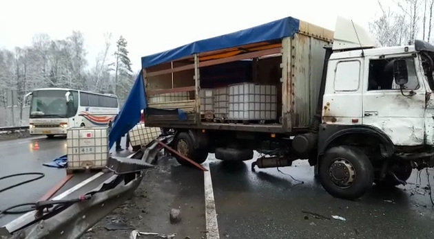 В одном из грузовиков перевозились ёмкости с аммиачным удобрением. В результате ДТП произошло опрокидывание двух ёмкостей по одному кубическому метру каждая. Вещество из одной ёмкости разлилось полностью, из второй – наполовину.