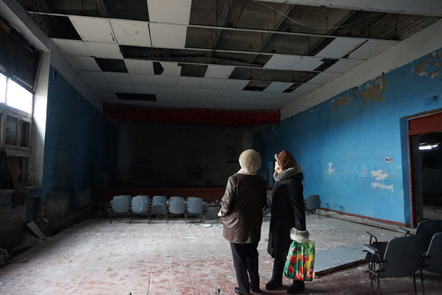 В пустом пространстве узнается большой зал. Остались ряды кресел, видны очертания сцены. Плиты потолка провалились. Разруха... Марии Александровне Киселевой особенно больно смотреть на нее. Она отработала здесь 34 года заведующей. Жизнь кипела, и не только в праздники! Мальчишки в теннис играли, бабушки - в шахматы и шашки. Был даже небольшой тренажерный зальчик и библиотека.